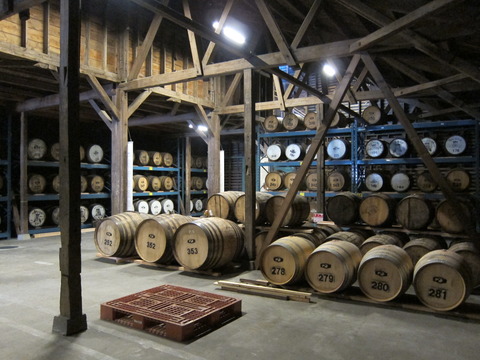 (三郎丸蒸留所の熟成庫。左側の壁の向こうには蒸留器などの設備があり、同じ建物の中で区分けされたスペース。比率はバーボン樽を中心に、シェリーやワイン樽なども。この他空調の入った冷温の貯蔵庫があり、熟成環境の違いとして他のクラフトにはない恩恵をもたらしている。)