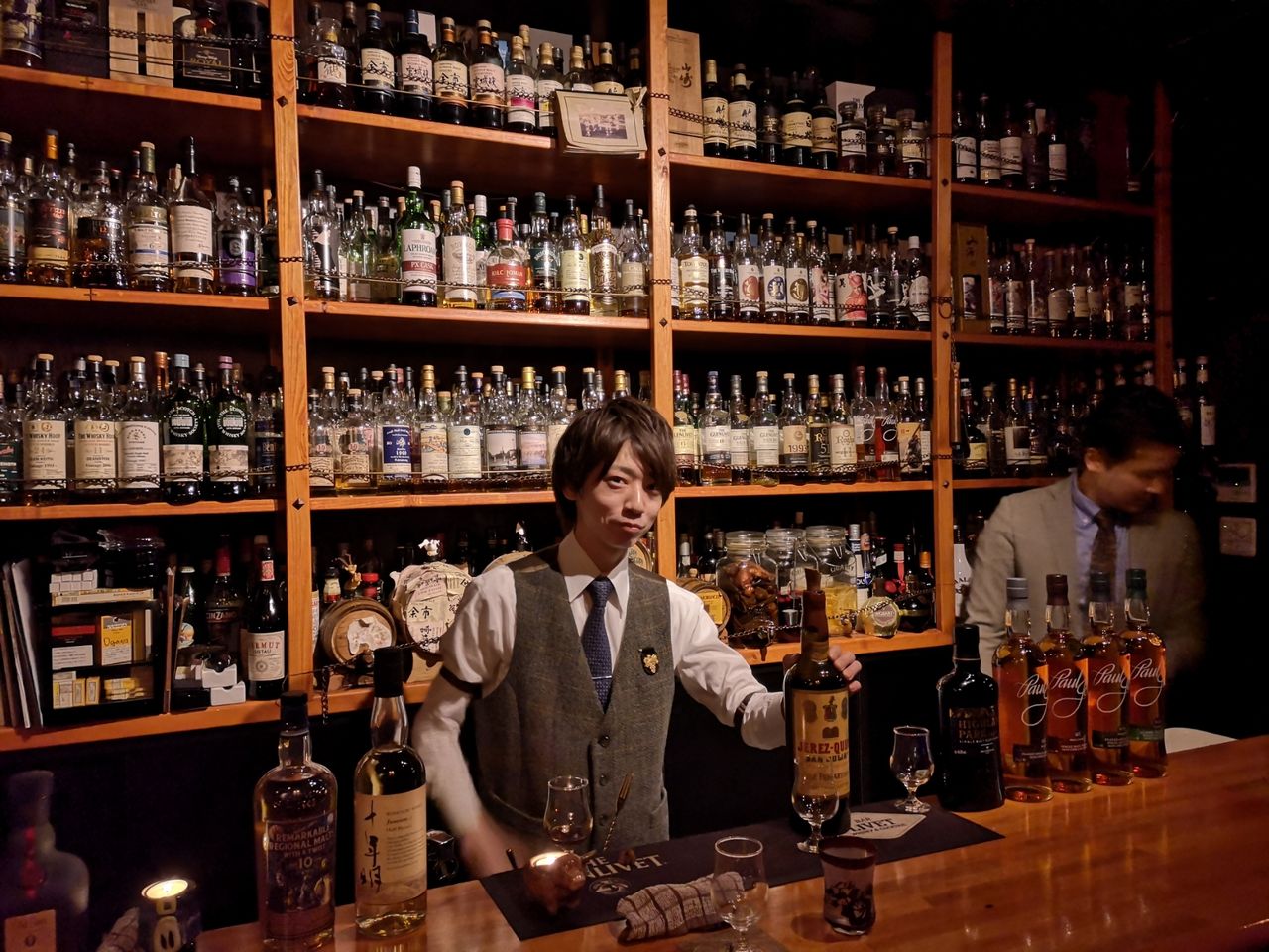 (BAR LIVET は本日2月21日で5周年を迎えた。ちゃっかりオーナーより目だっているバーマンの小倉さん。2号店オープンやオリジナルボトル、そしてウィスクテイルなど、今後のさらなる発展が楽しみ。)