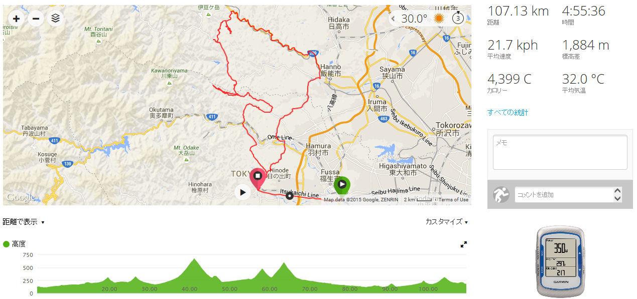 ざっくり書くと、アップがてら大垂水峠を登って相模湖に抜け、湖畔から18号線で奥多摩方面に向かい、都民の森を周回する形