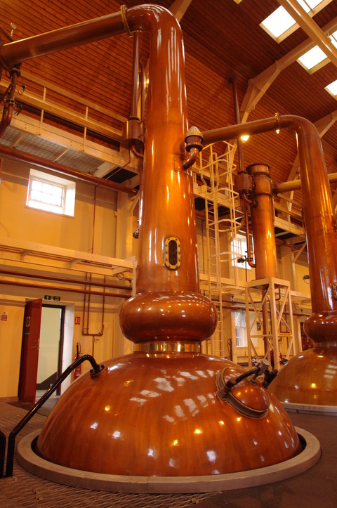 (グレンモーレンジ蒸留所のトレードマークとも言える、細く背の高いポットスチル。現行品の10年を飲むと、爽やかでライトな香味がこのスチルの形状とぴったりマッチする。Photo by T.Ishihara)