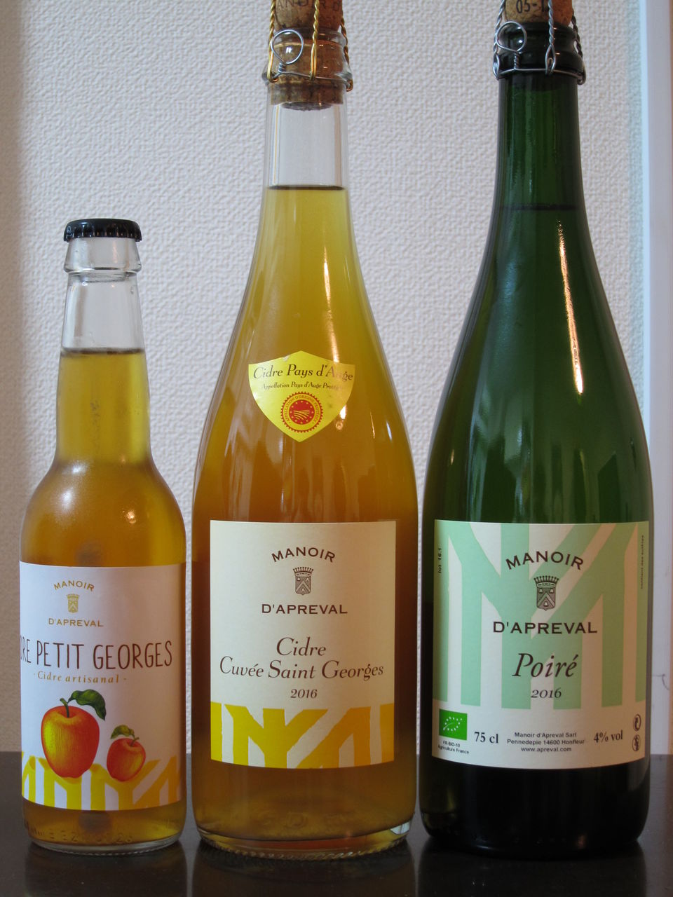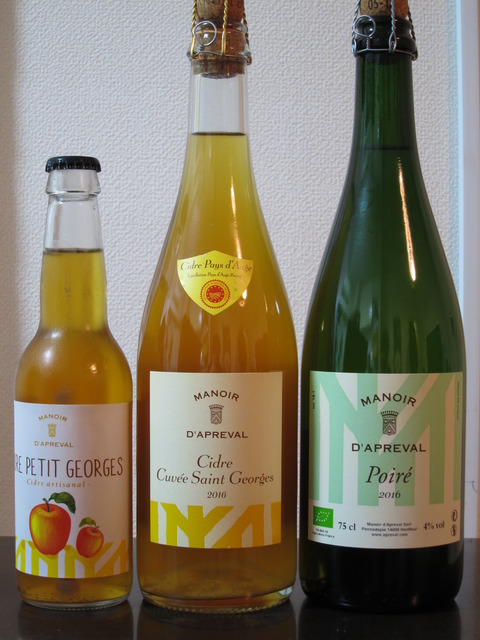 写真左側のサイダー。中身はその隣のアプルヴァルの中辛口シードル、キュベサンジョルジュと同じ製法で作られているとのこと。ただコルク栓ではないために、AOCの関係で名前が違うのだとか。早速飲み比べてみると、発酵の方法が違うのかサイダーの方がガス圧が強く、少し軽い印象を受けますが、確かに味の傾向は同じですね。